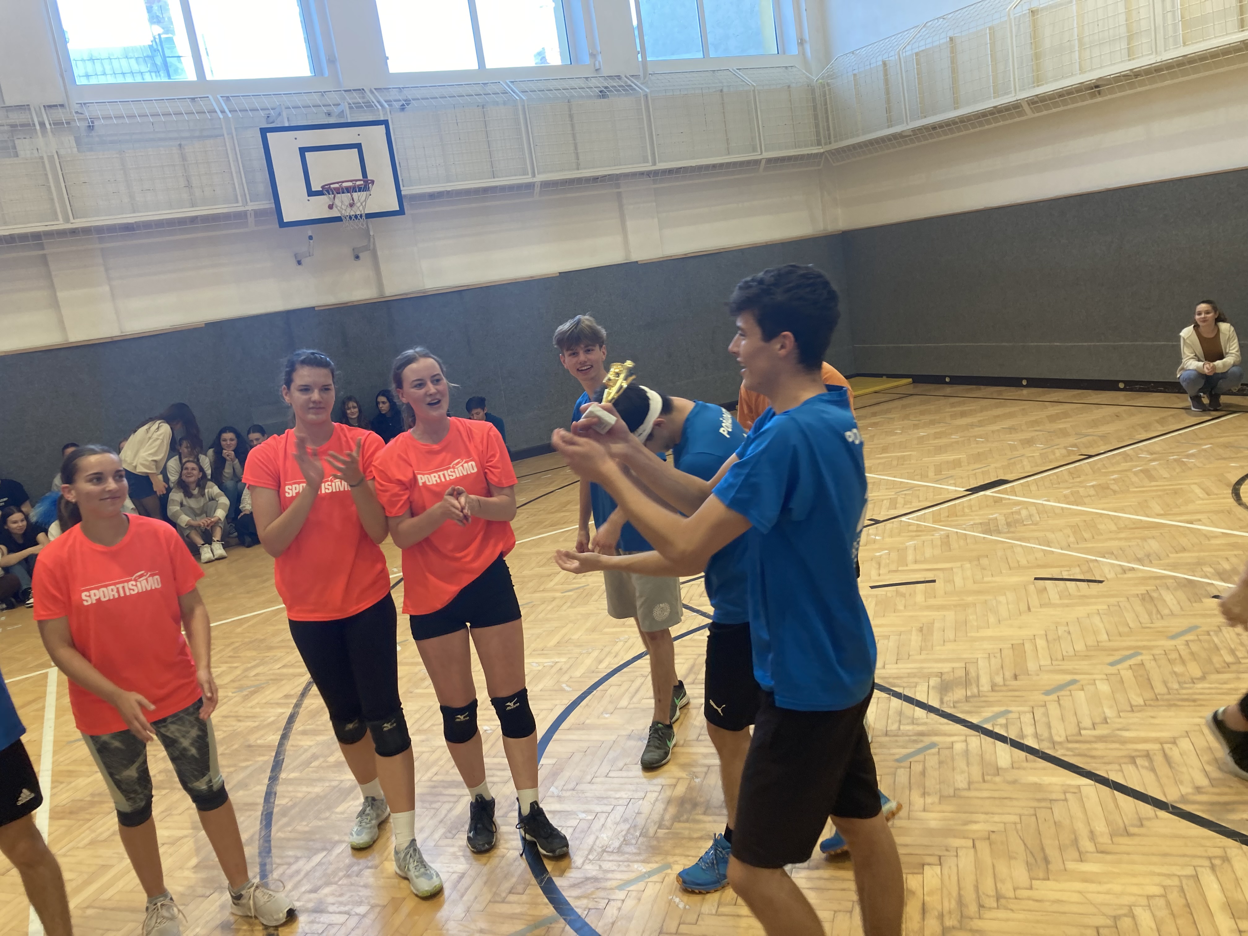 (Od Milana Káni) Ve čtvrtek 16.listopadu proběhl ve velké tělocvičně tradiční mezitřídní volejbalový turnaj, který patří k nejsledovanějším sportovním událostem na naší škole. Téměř každý student gymnázia se přišel alespoň na chvíli podívat. A kdo ne, může jen litovat, že neshlédl famózní zákroky s míčem hraničící s vrcholnou akrobacií a ekvilibristikou, hodné artistů pod šapitó! :-) A jak to dopadlo? Vyhrálo družstvo na titulní fotce.